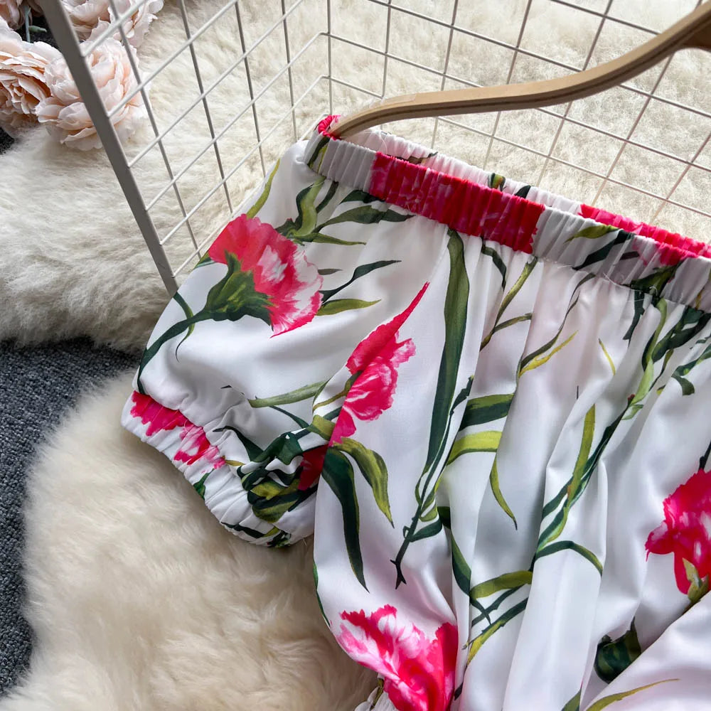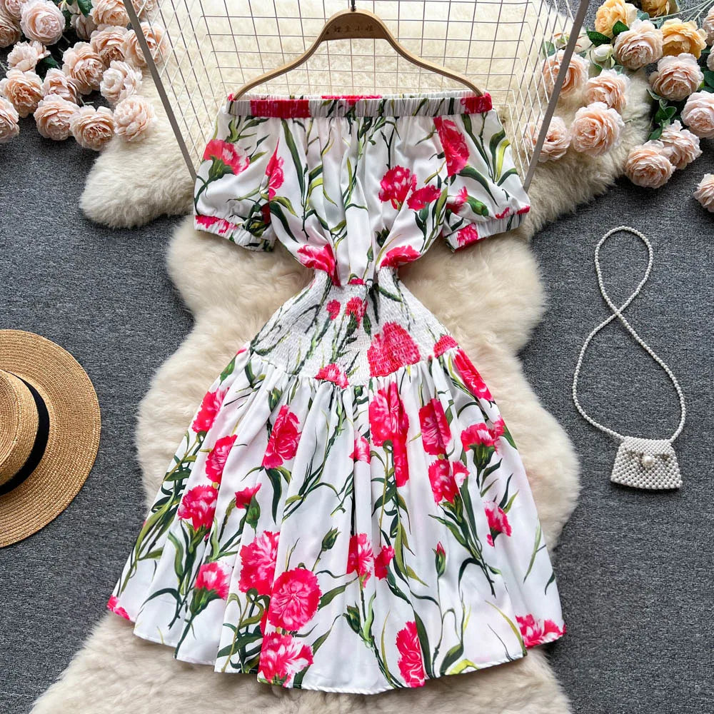 Women Elegant Vintage Floral Print Dress 2023 Summer Short Sleeve Off Shoulder Dress Shirred Elastic Waist Beach Holiday Dress