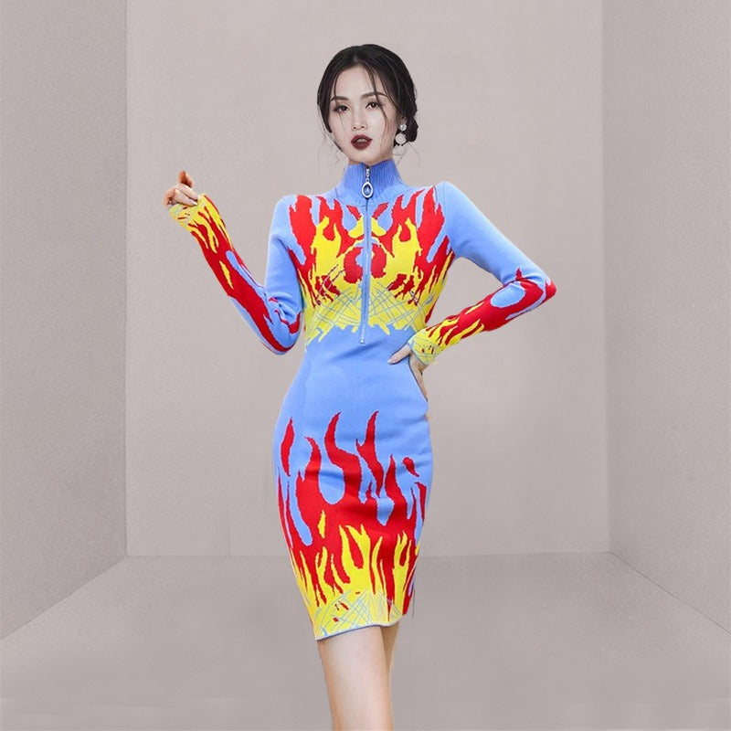 Women Knitted Sweater Dress Zipper Collar Long Sleeve Casual Dress