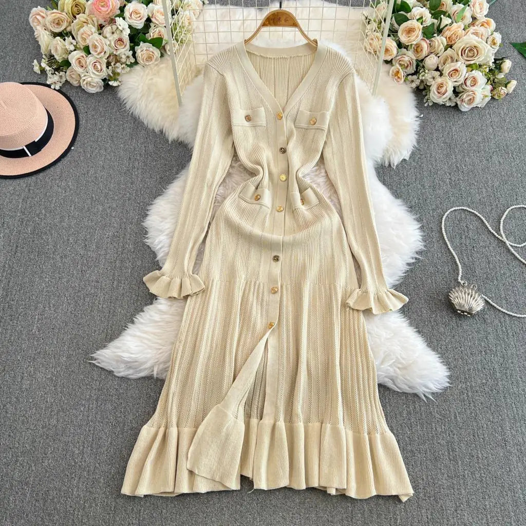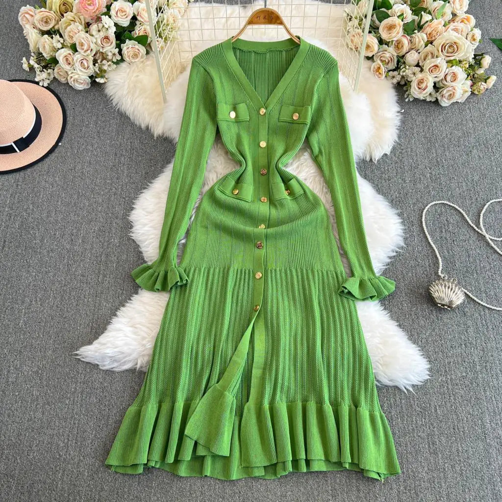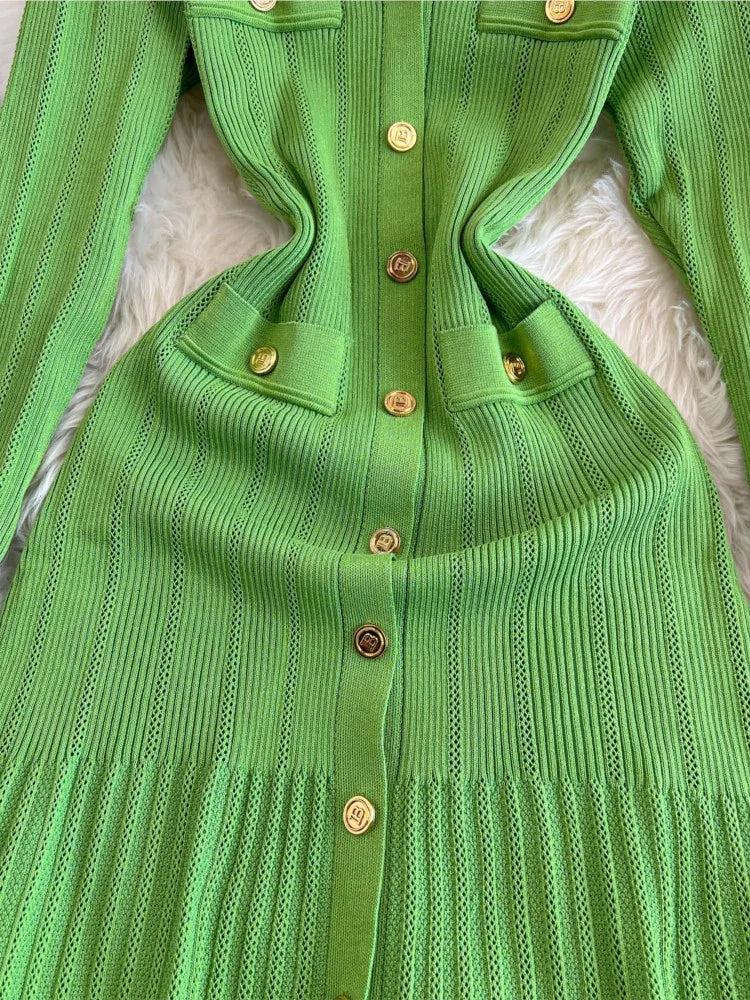 Women Vintage Mermaid Knitted Dress Elegant Casual Single Breasted Bodycon Slim Evening Dresses Female One Piece Clothes Mujers