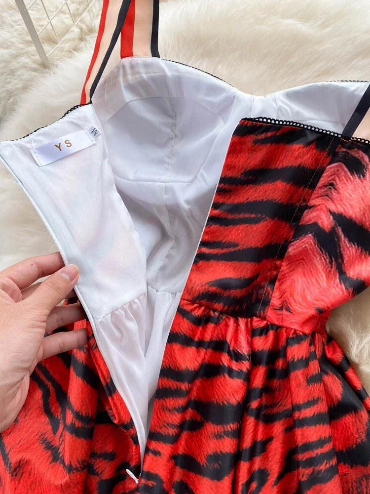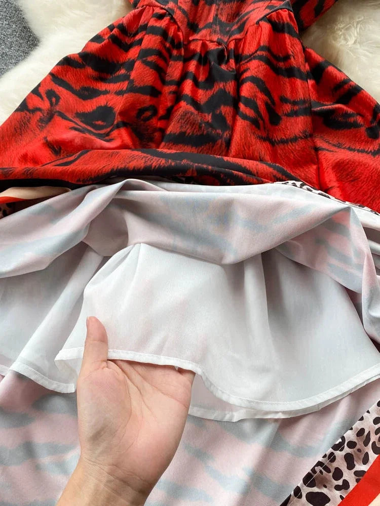 Women Vintage Party Dress Summer Leopard Print Three-dimensional Midi Dresses Ladies Elegant A Line High Waist Long Robe