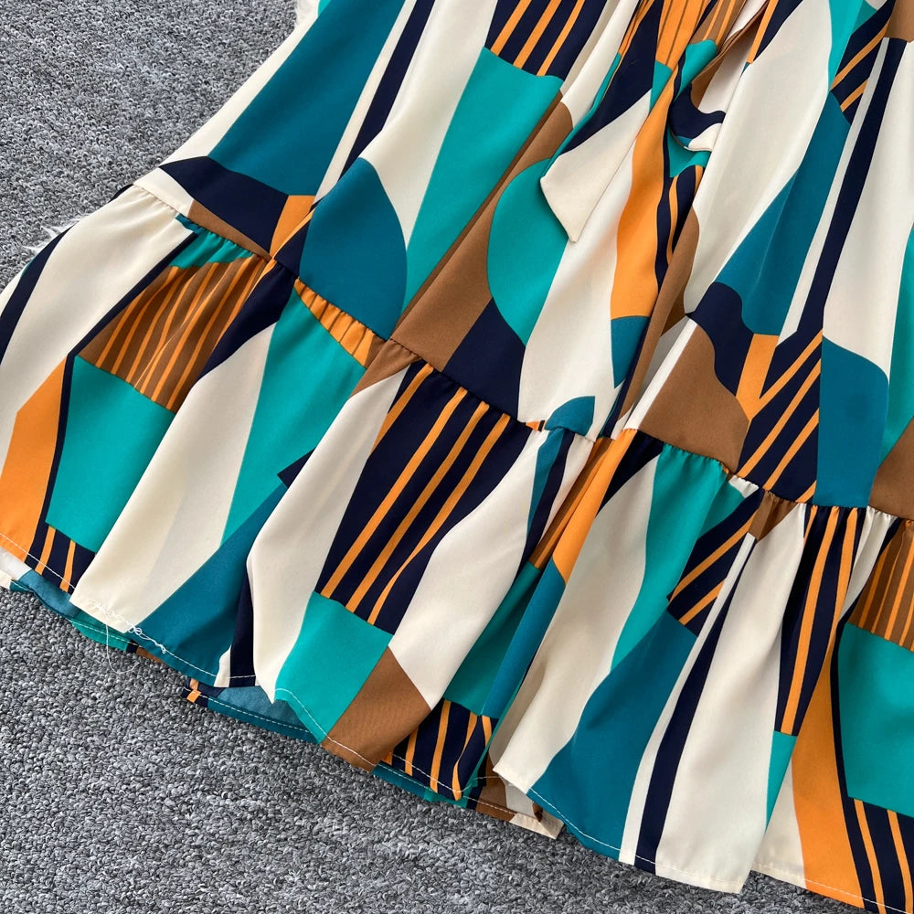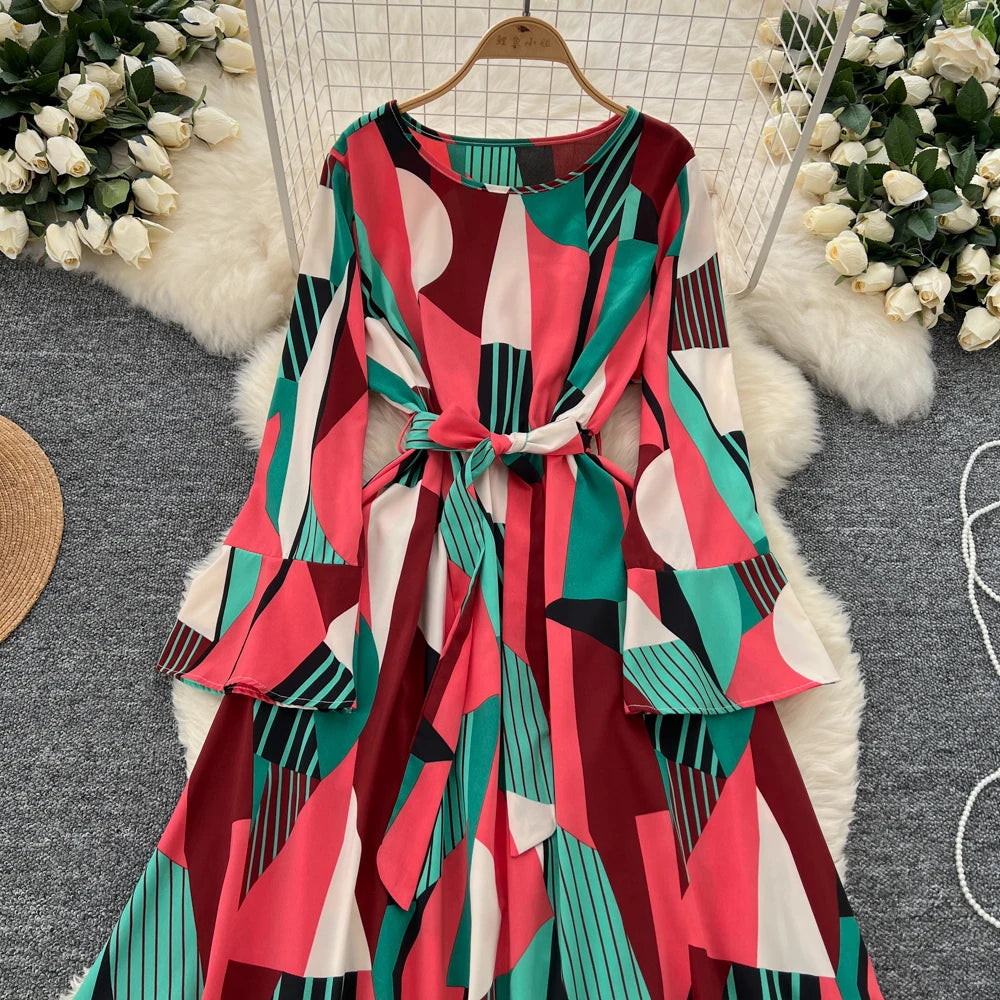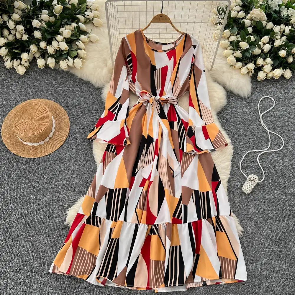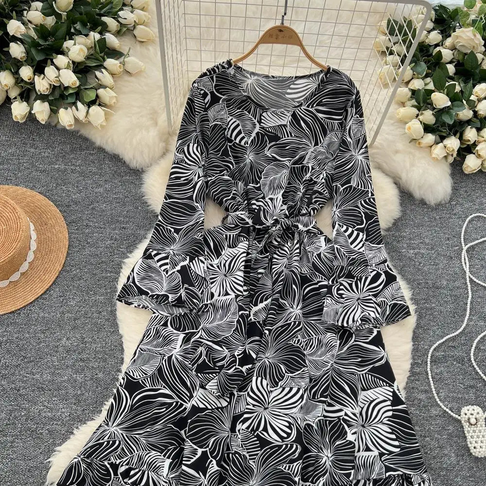 Women Vintage Print Dress for Women Autumn Flare Long Sleeves Lace Up Ruffles Slim Waist Evening Party Dresses A-Line Vestidos