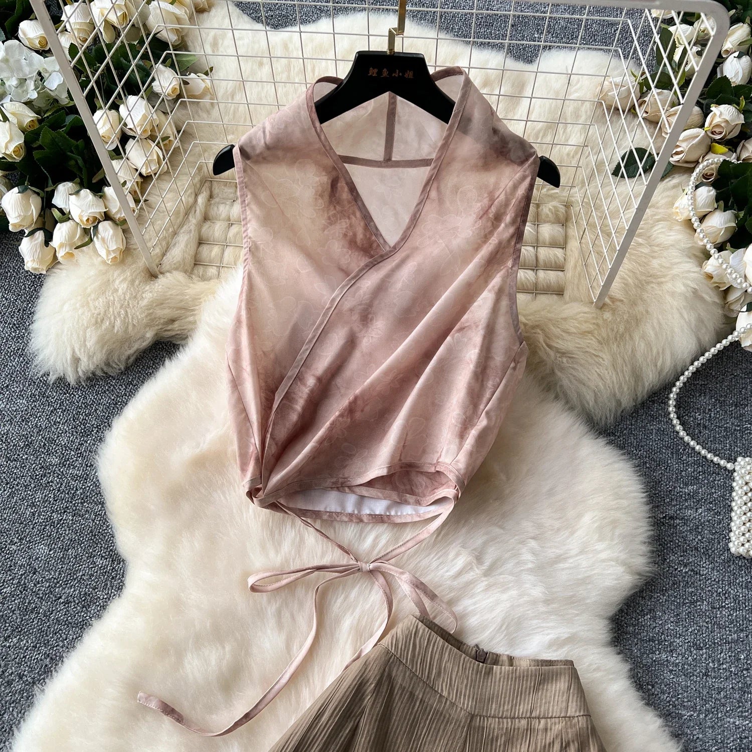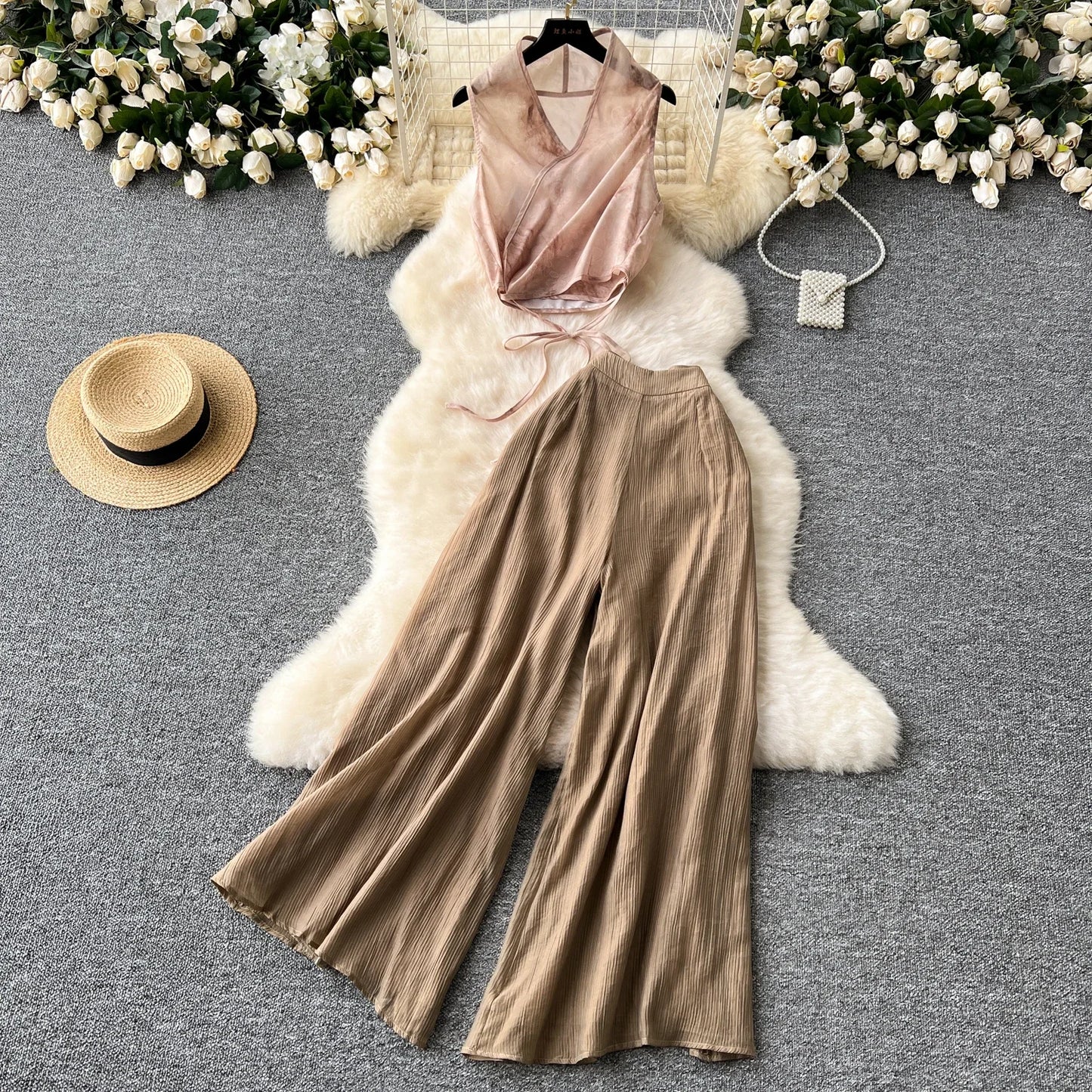 Women Vintage Two Pieces Skirt Sets Women sleeveless Crop Top Elastic Waist High Elastic loose Wide leg pant