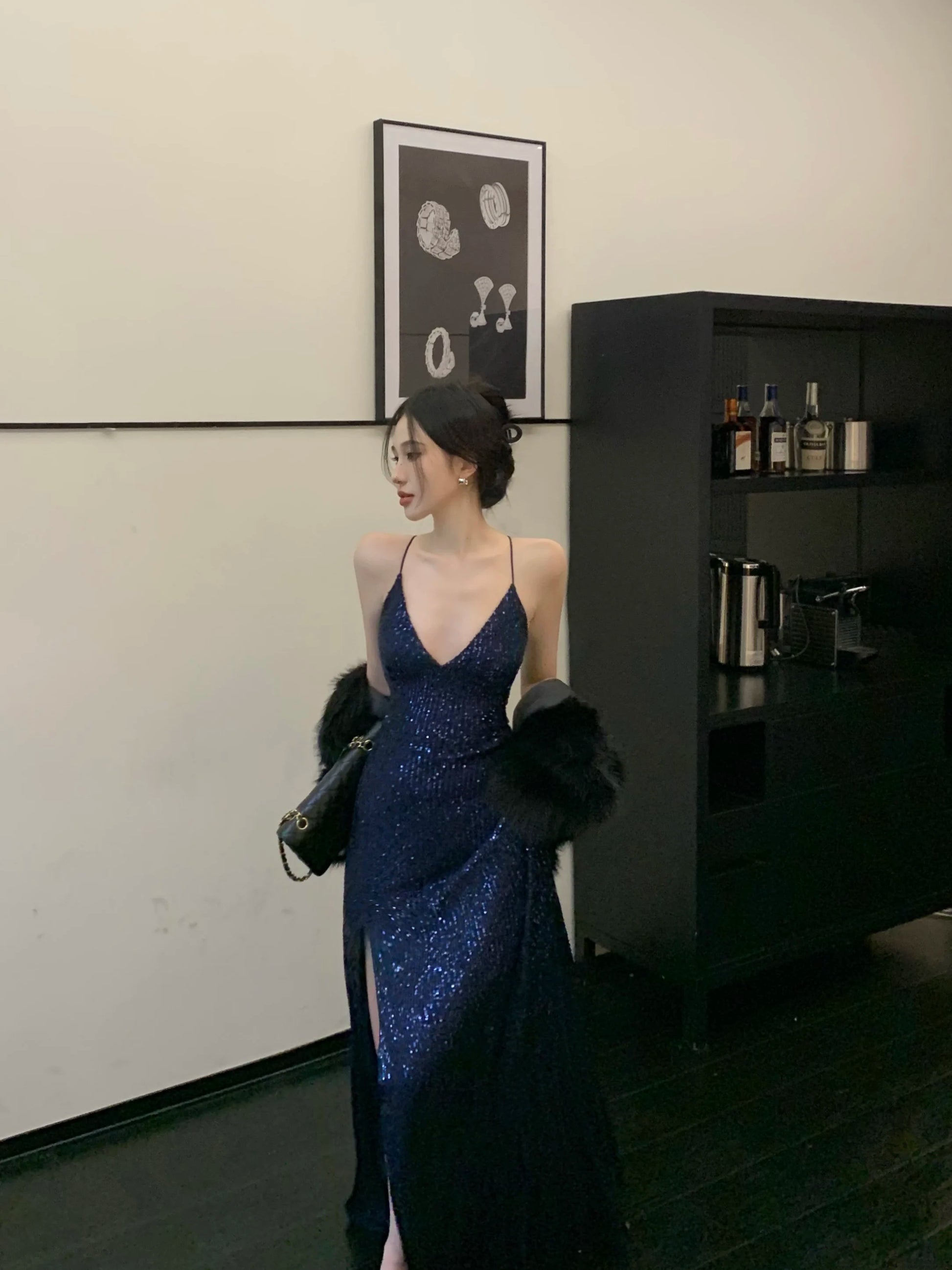 Women's Backless V-Neck Split Maxi Dress Sexy Slim Evening Gown Luxury Dresses Fashion Robe Birthday Party Spring Autumn New