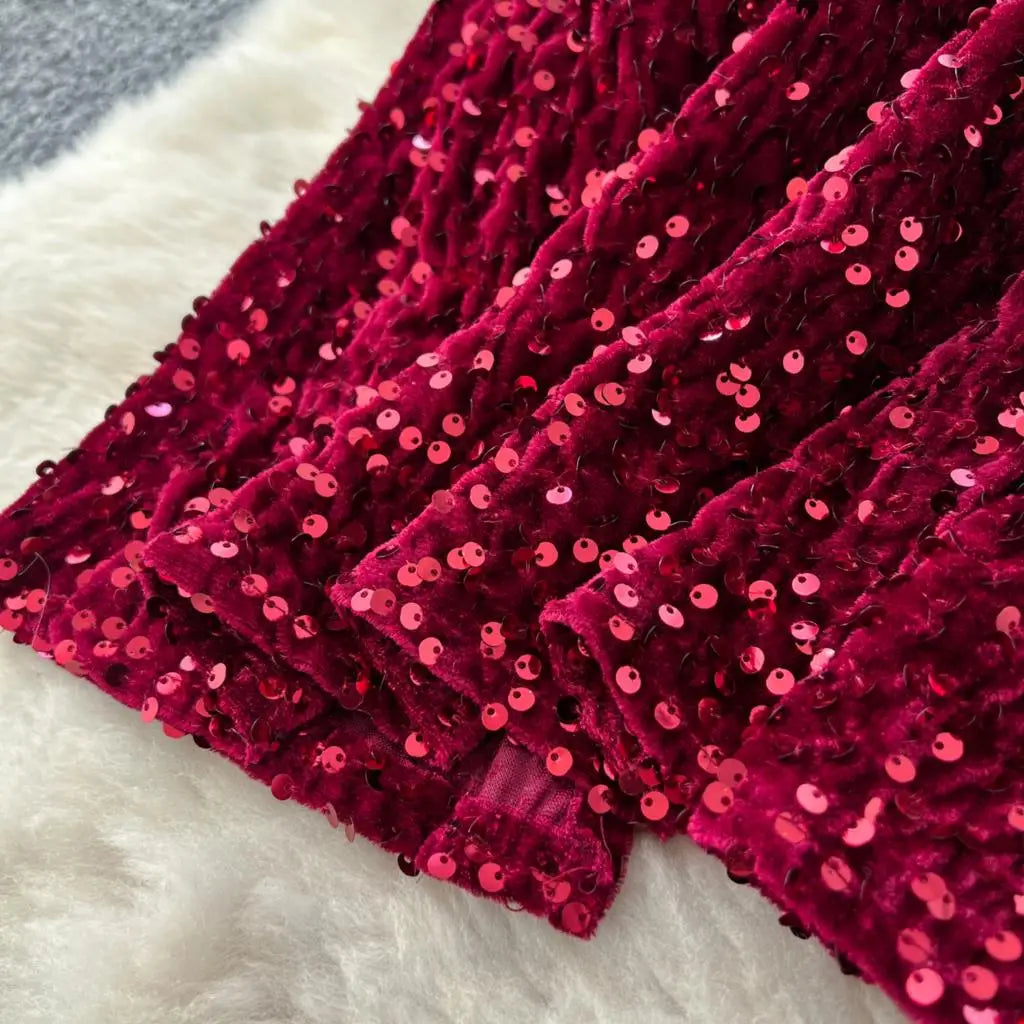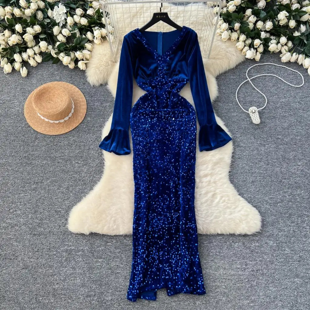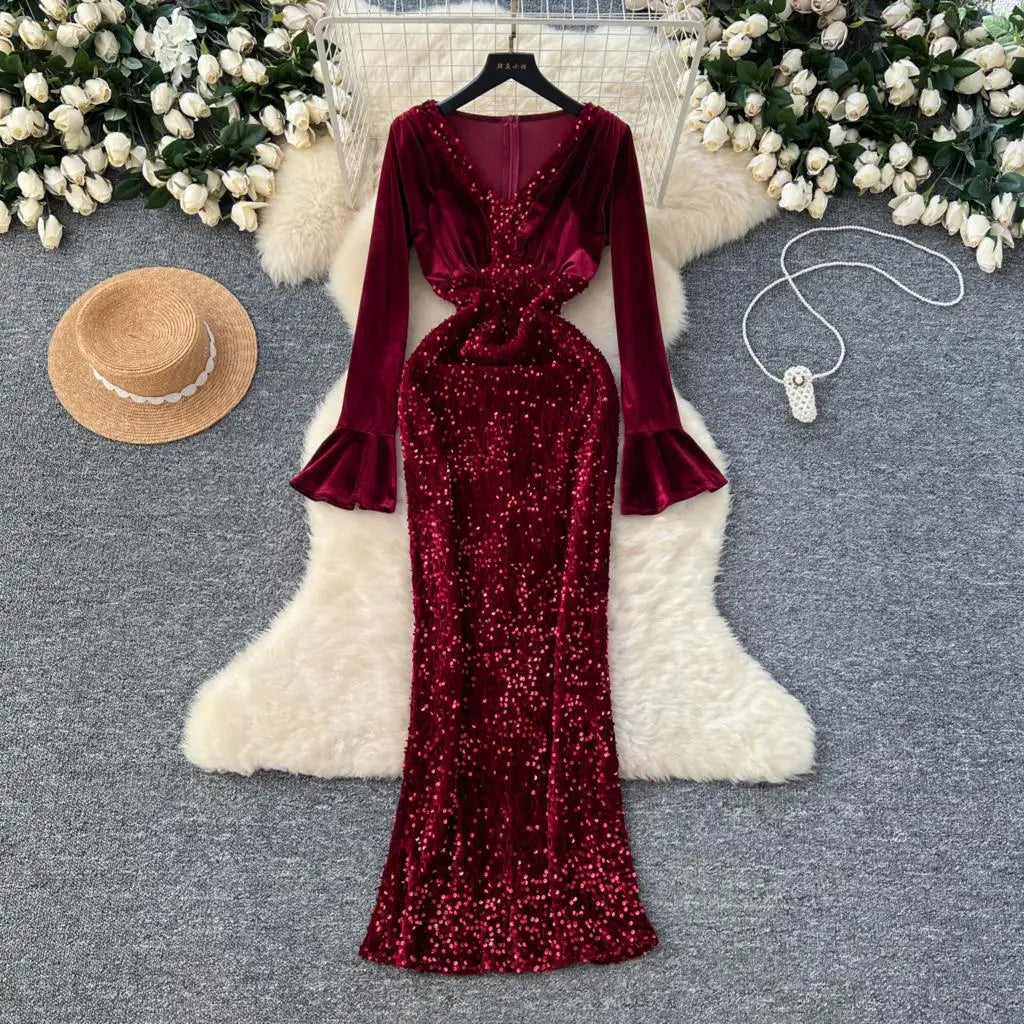 Women's Sexy Velvet Evening Gown Luxury Dresses V-Neck Flare Sleeve Split Long Dress Fashion Slim Robe Birthday Party Autumn New