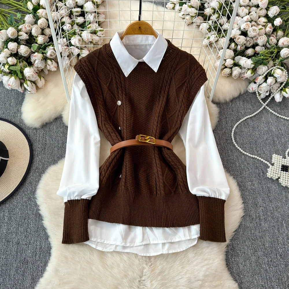 XFPV Women's Sweet Long Sleeve Shirt Top Sweater Knitted Vest Shirt Two Piece Set Y2k Korean Fashion Tide Autumn 2024 SM11613